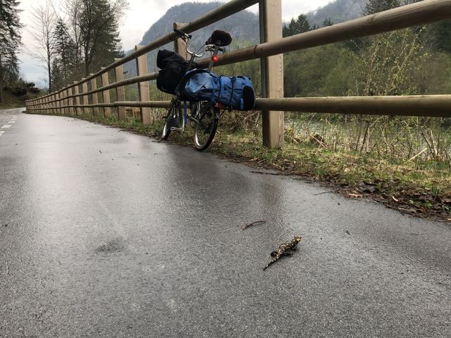Uit de trein vanaf Lesce, SLO, 30 km door mild bergachtige omgeving gefietst over een soort eco-fietssnelweg. Vuursalamander (Salamandra salamandra) helpen oversteken.