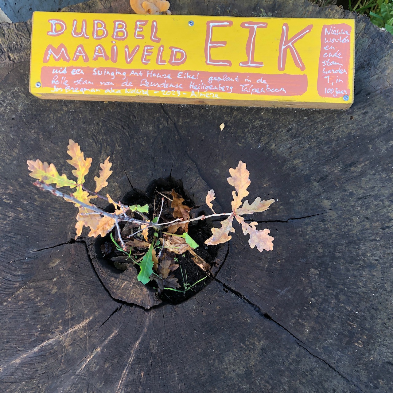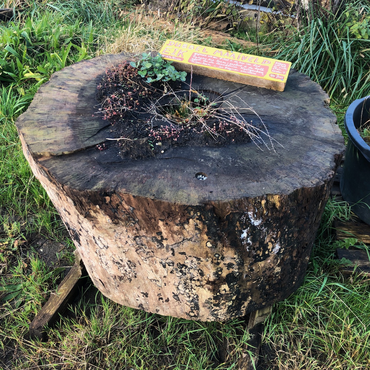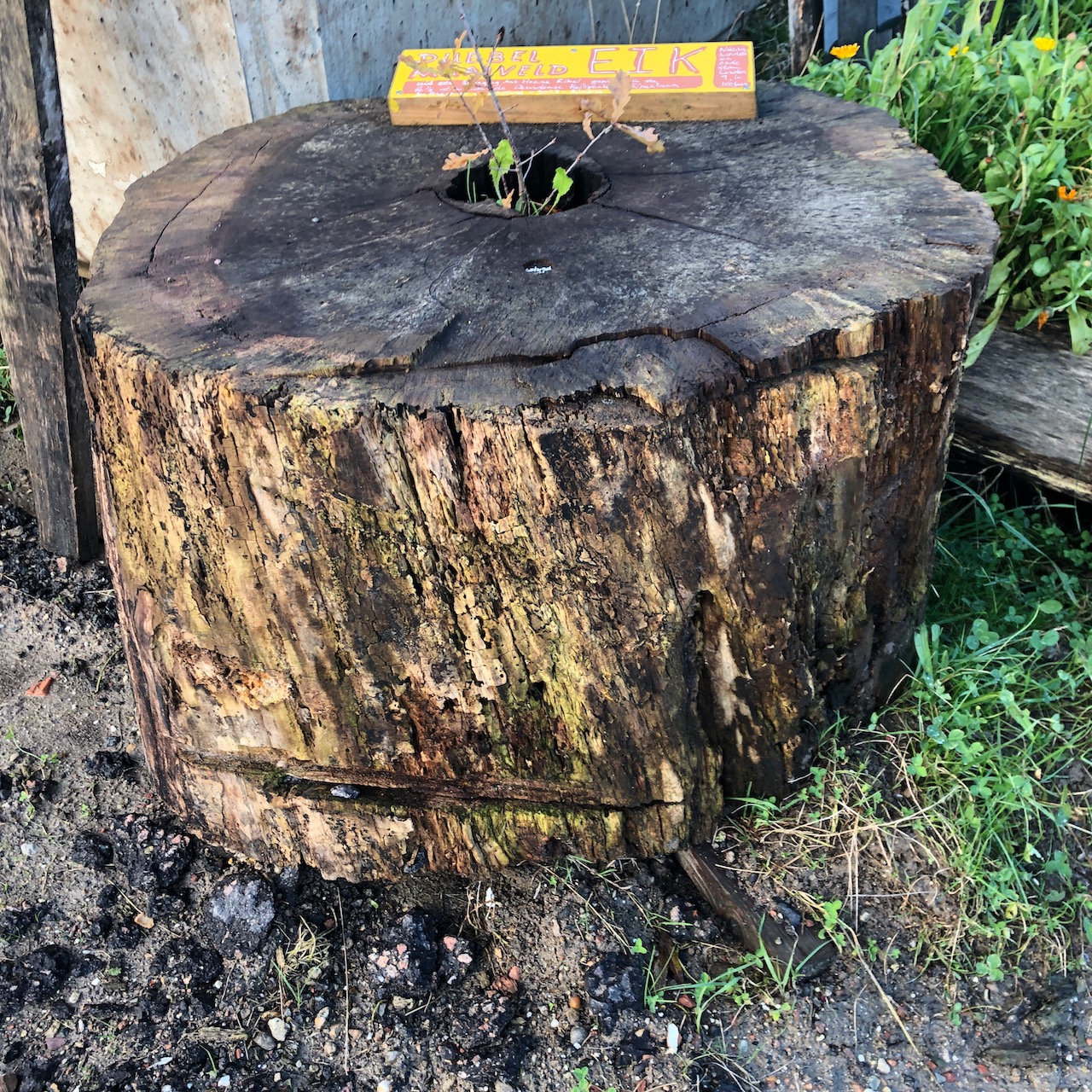 De stam was hol, ik vul het met aarde en daar plant ik een eikel in. Voor deze zaailing is de bovenkant van de stam het maaiveld. We noemen het maaiveld II. Het boompje is zo jong dat het zich helemaal kan aanpassen aan de omgeving, wortels gaan groeien. Het helpt dat dood hout enorm goed is in het vasthouden van vocht.