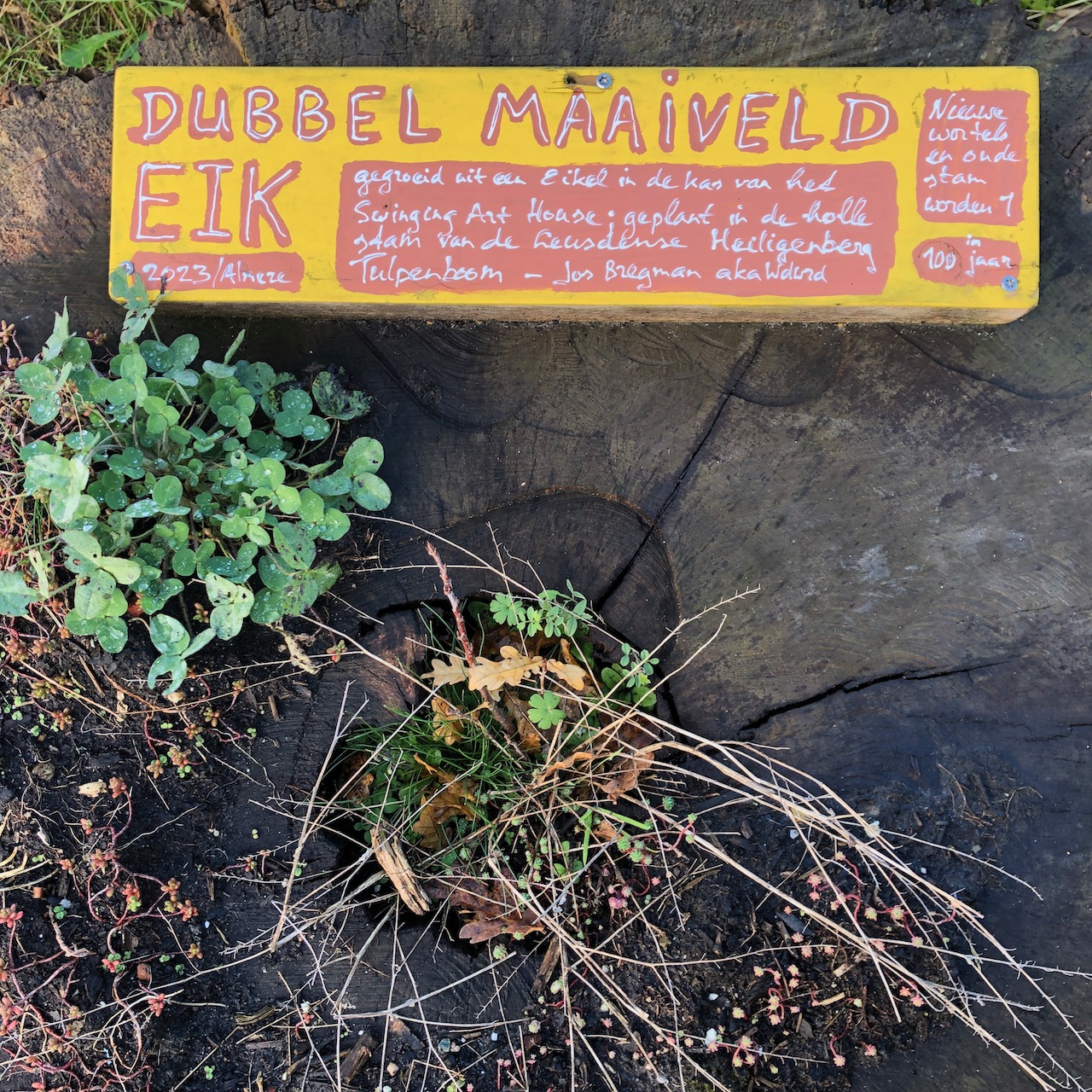 Bij de stam plaats ik een manshoge stalen plaat met daarin het chipnummer gestanst. Via het chipnummer in mijn database blijft de link met het geheel voor de eeuwen bewaard. De oorspronkelijke groeiplaats van de Tulpenboom is een heilige plek in het landschap.